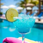 4- Take a moment to admire the stunning blue hue of your Blue Lagoon Margarita, with the crushed ice glistening and the lime wedge perched atop the drink, inviting you to take a sip.