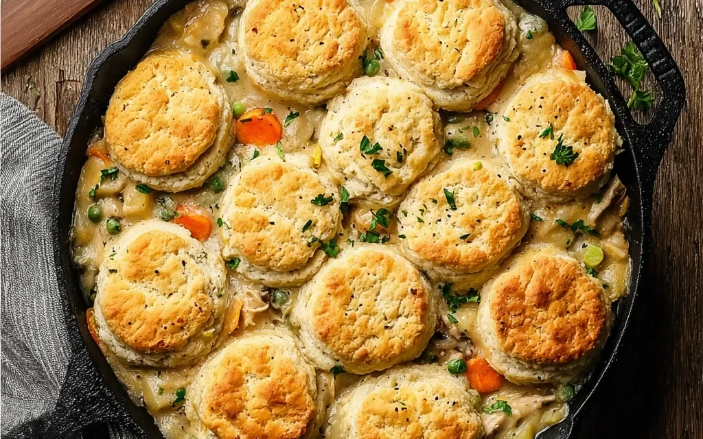 Indulge in a comforting and delicious Chicken Pot Pie topped with flaky, buttery biscuits for a heartwarming meal the whole family will love.
