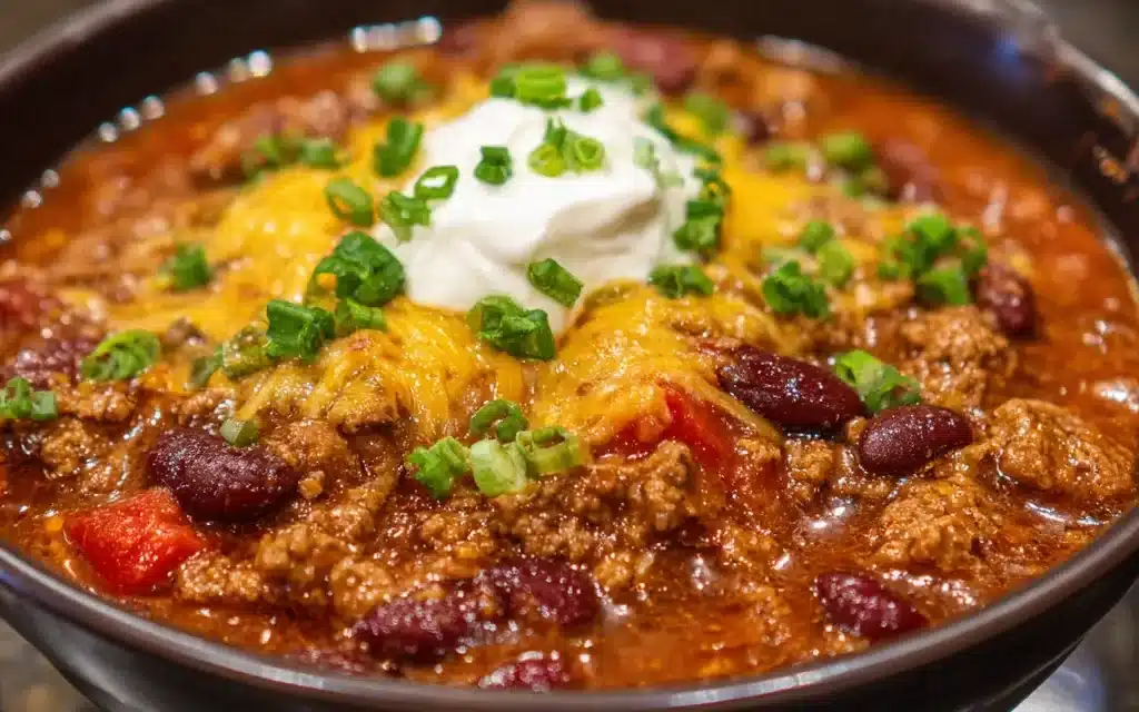 6- Ladle the Crockpot Chili Recipe into bowls and serve hot, garnished with your favorite toppings like shredded cheese, sour cream, and chopped green onions.