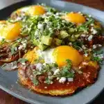 Huevos Rancheros is a classic Mexican breakfast dish featuring fried eggs on crispy corn tortillas, topped with a flavorful salsa, creamy refried beans, and fresh garnishes. This quick and easy recipe is perfect for a satisfying morning meal.