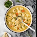 4- Using a spoon or small scoop, gently drop the dumpling dough into the simmering broth, creating bite-sized pieces. Cover the pot and let the dumplings cook for 10-12 minutes, or until they’re fluffy and cooked through.